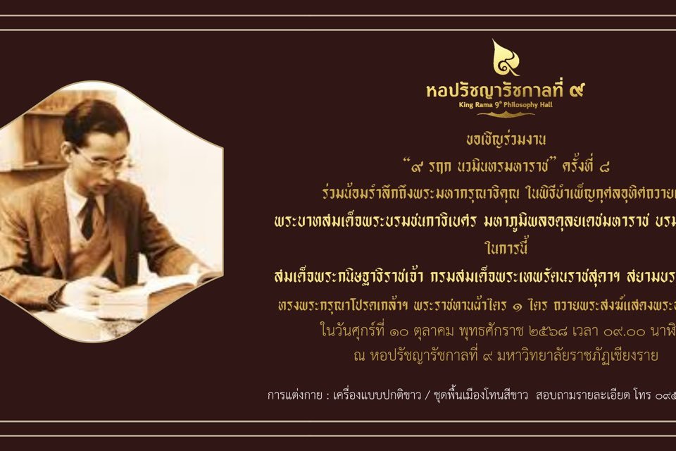 หอปรัชญารัชกาลที่ ๙ มหาวิทยาลัยราชภัฏเชียงราย ขอเชิญร่วมงาน “๙ รฤก นวมินทรมหาราช” ครั้งที่ ๘ ร่วมน้อมรำลึกถึงพระมหากรุณาธิคุณ ในพิธีบำเพ็ญกุศลอุทิศถวายแด่ พระบาทสมเด็จพระบรมชนกาธิเบศร มหาภูมิพลอดุลยเดชมหาราช บรมนาถบพิตร ในการนี้ สมเด็จพระกนิษฐาธิราชเจ้า กรมสมเด็จพระเทพรัตนราชสุดาฯ สยามบรมราชกุมารี ทรงพระกรุณาโปรดเกล้าฯ พระราชทานผ้าไตร ๑ ไตร ถวายพระสงฆ์แสดงพระธรรมเทศนา ในวันศุกร์ที่ ๑๐ ตุลาคม พุทธศักราช ๒๕๖๘ เวลา ๐๙.๐๐ นาฬิกา ณ หอปรัชญารัชกาลที่ ๙ มหาวิทยาลัยราชภัฏเชียงราย การแต่งกาย : เครื่องแบบปกติขาว / ชุดพื้นเมืองโทนสีขาว สอบถามรายละเอียด โทร ๐๙๕ - ๖๗๘๕๓๑๗ ดูน้อยลง